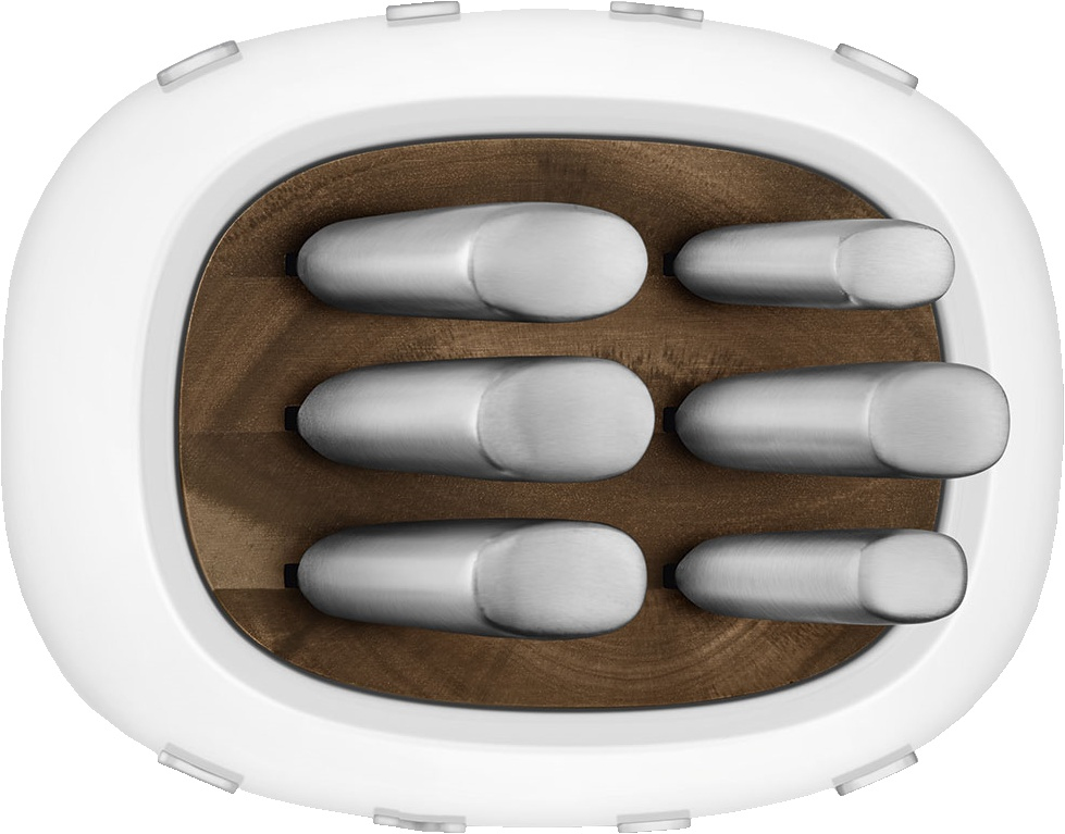 Комплект включает ножи, изготовленные из высококачественной нержавеющей стали немецкого сплава, что гарантирует долговечность и устойчивость к коррозии. Пазы для ножей выполнены из дерева акации, что добавляет набору утончённости и природного тепла. Прочный корпус и основание из глянцевого пластика с хромированной отделкой подчеркивают премиальный вид набора.